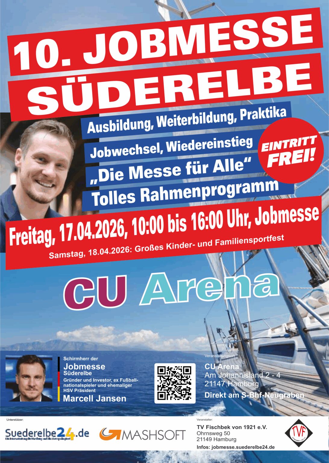 Süderelbe – Am Freitag, den 17. April 2026, findet die Jobmesse Süderelbe zum zehnten Mal statt – ein echtes Jubiläum für die ehrenamtlich vom TV Fischbek organisierte Veranstaltung. Unternehmen aus der Region haben noch die Chance, sich als Aussteller anzumelden und ihr Engagement in Sachen Ausbildung, Fachkräftegewinnung und Karrierechancen zu präsentieren. Zum zehnten Mal bringt die Jobmesse Süderelbe Betriebe mit Schülern, Studierenden, Quereinsteigern und Fachkräften zusammen. Die Messe hat sich als fester Baustein im regionalen Arbeitsmarkt etabliert und bietet eine Plattform für direkte Gespräche, praktische Einblicke und neue berufliche Perspektiven. Der TV Fischbek organisiert die Messe mit großem ehrenamtlichem Einsatz…