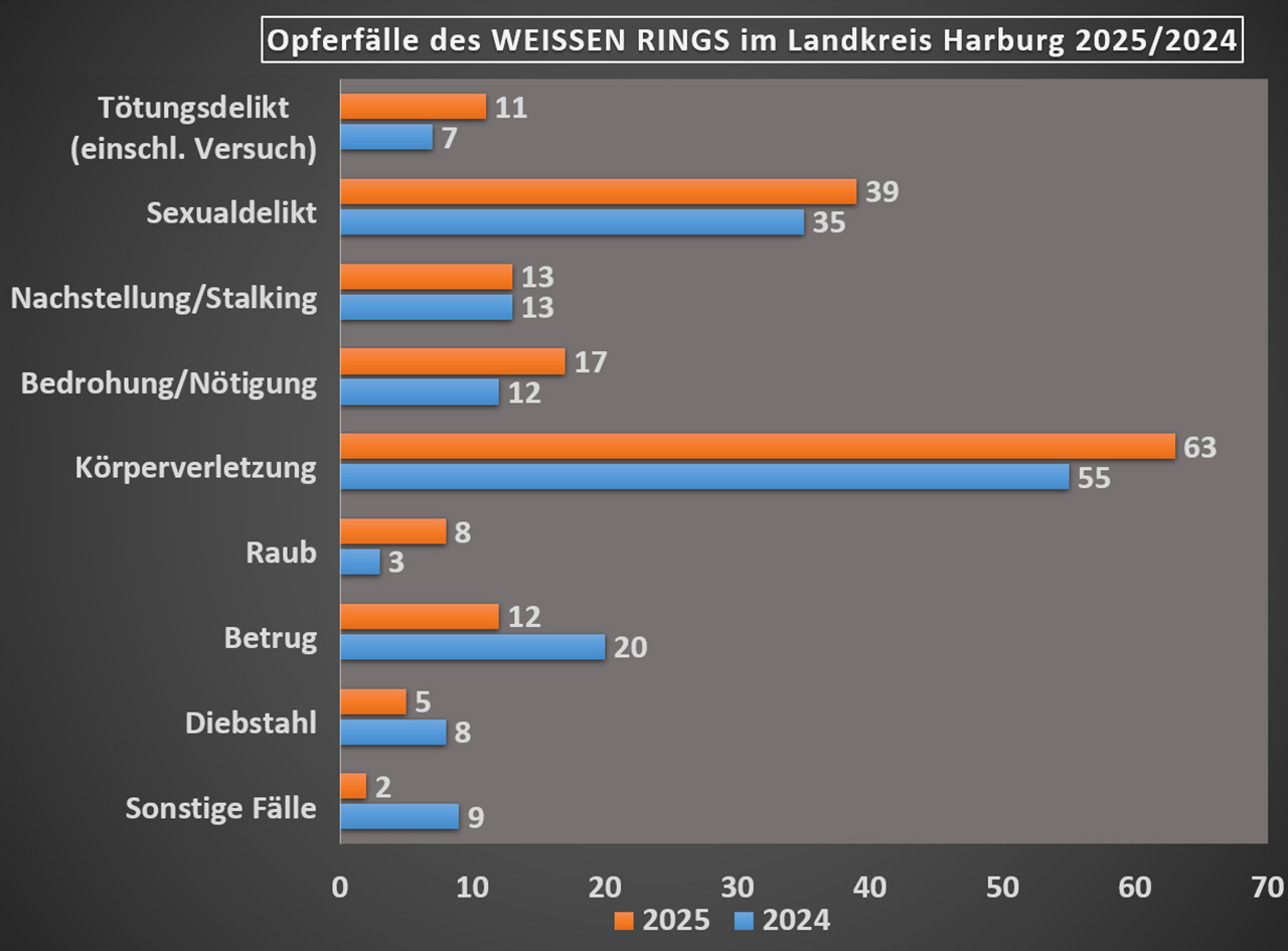 Landkreis Harburg – Die Außenstelle des WEISSEN RINGS im Landkreis Harburg hat im Jahr 2025 insgesamt 170 Menschen nach erlebten Straftaten begleitet. Damit ist die Zahl im Vergleich zum Vorjahr mit 162 Fällen erneut leicht gestiegen. Der Jahresrückblick zeigt, dass der Bedarf an professioneller und verlässlicher Unterstützung für Betroffene im Landkreis weiterhin auf hohem Niveau…