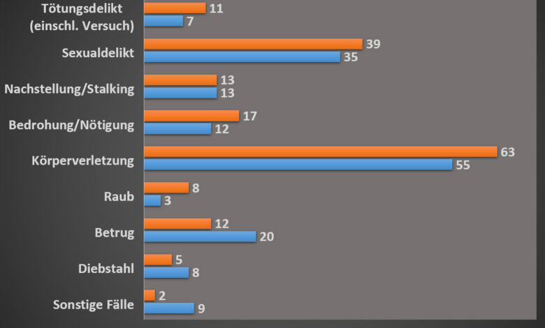 Neben Gewalt- und Sexualstraftaten spielten auch Nachstellung, Bedrohung und Nötigung eine wichtige Rolle, häufig im Zusammenhang mit Trennungen. Ebenso bearbeitete die Außenstelle Fälle von Raub, Diebstahl und Betrug. Nach Einschätzung des Vereins verlagern sich dabei insbesondere Betrug und Hasskriminalität zunehmend in den digitalen Raum.